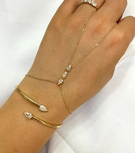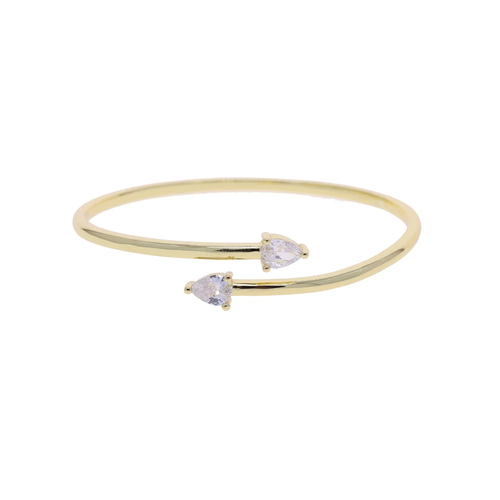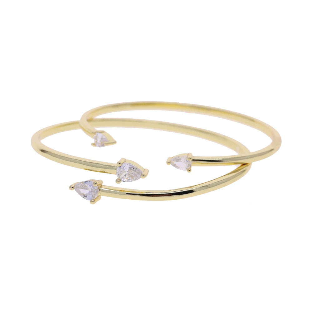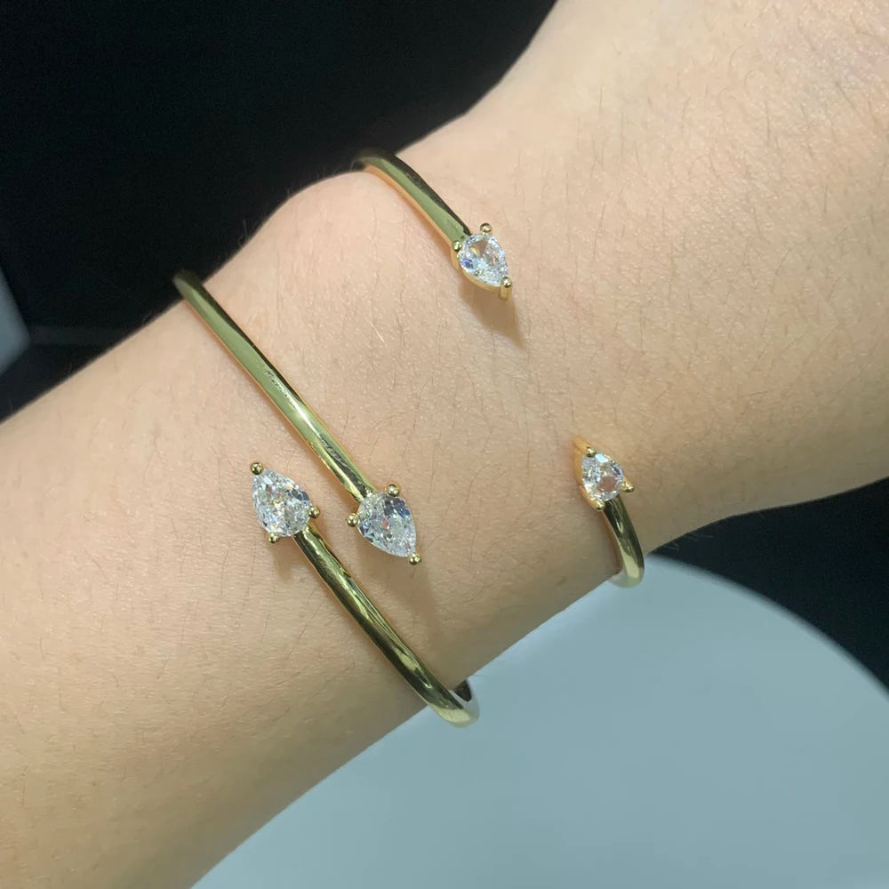 A 5A-grade CZ teardrop stone anchors this open wrap cuff in undeniable sparkle. The adjustable silhouette ensures a perfect fit, while the 18K gold plating brings a fine-jewelry feel to an accessible price point. A standout piece that works beautifully alone or as the focal point of a layered wrist.
