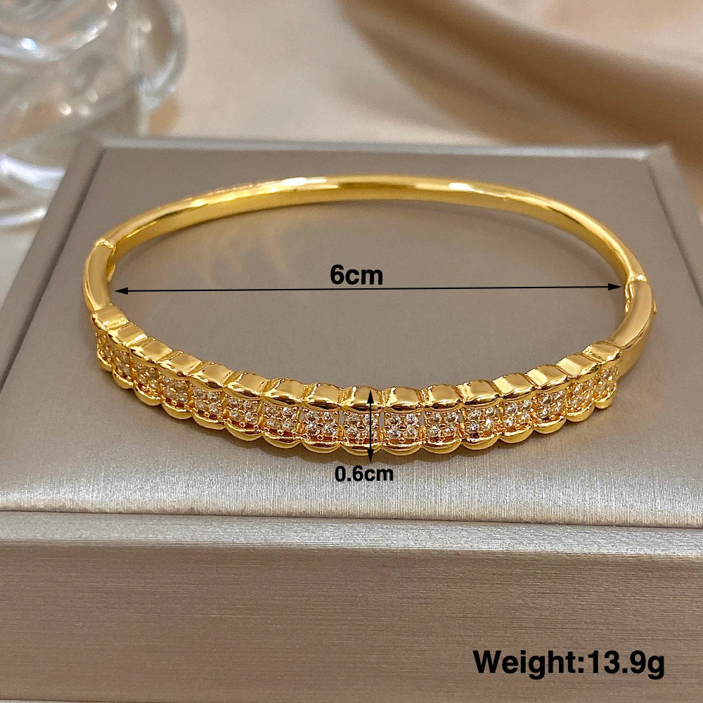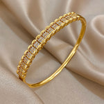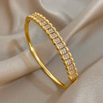 Multiple rows of micro-pavé zirconia create a brilliance that rivals fine jewelry at an accessible price. The gold-plated layered cuff hugs the wrist with a refined, architectural look — beautiful paired with an evening look or adding sparkle to a casual daytime stack.