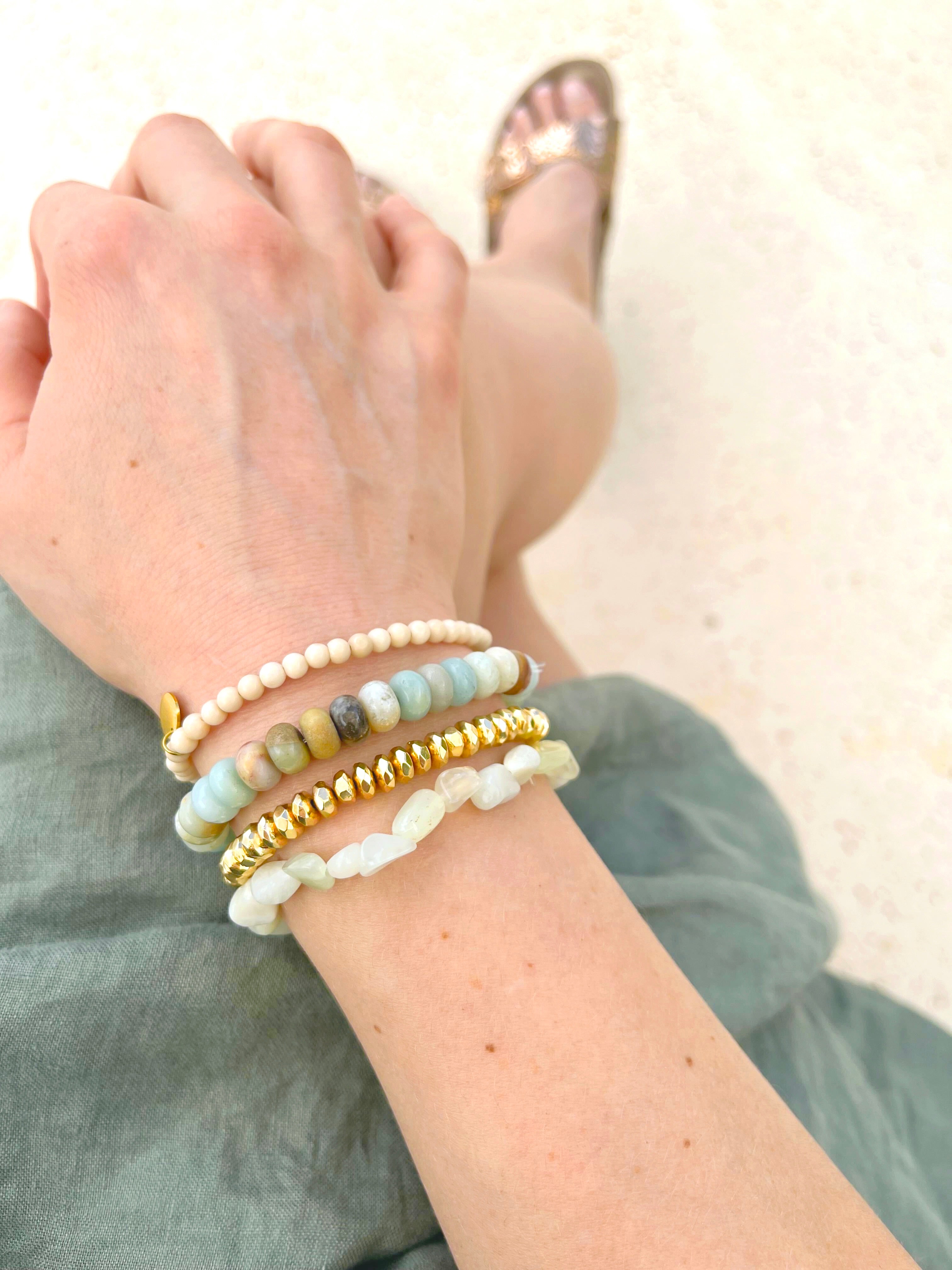 This layered set is a beach-y sparkler. Adorned with genuine Amazonite stones and gold plated beads, mix and match them with other stacking pieces for a custom look!