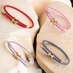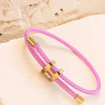 Add a playful touch of sophistication to your style with this Pastel Braided Gold Bracelet. The soft pink and blue braided cord creates a fresh, modern look, beautifully complemented by the polished gold-tone hardware. Lightweight and comfortable, it sits elegantly on the wrist while adding a pop of color to any outfit.