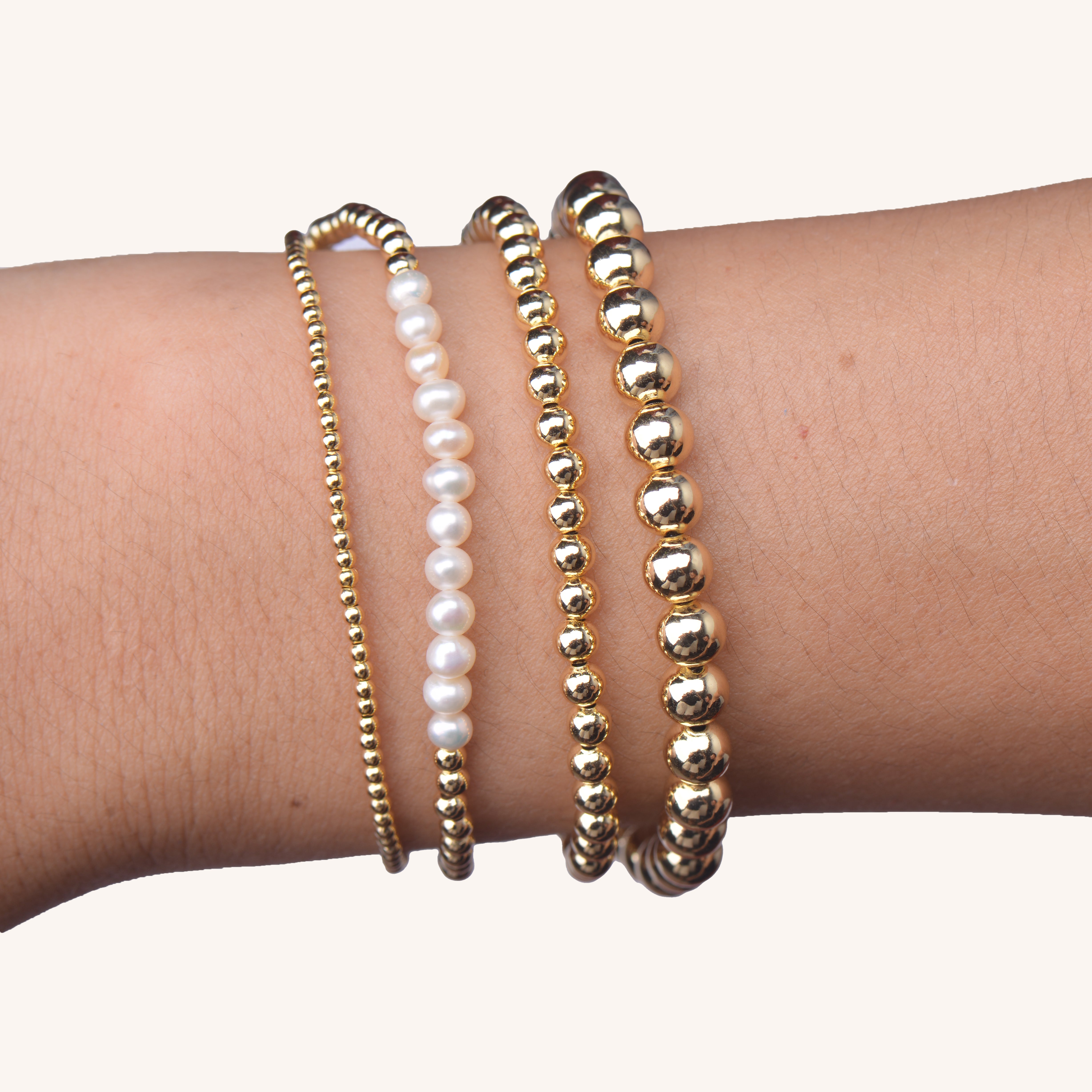 This set includes a sleek gold and a delicate pearl bracelet, perfect for layering or wearing on their own. Elevate any outfit with these timeless pieces.