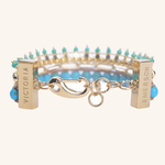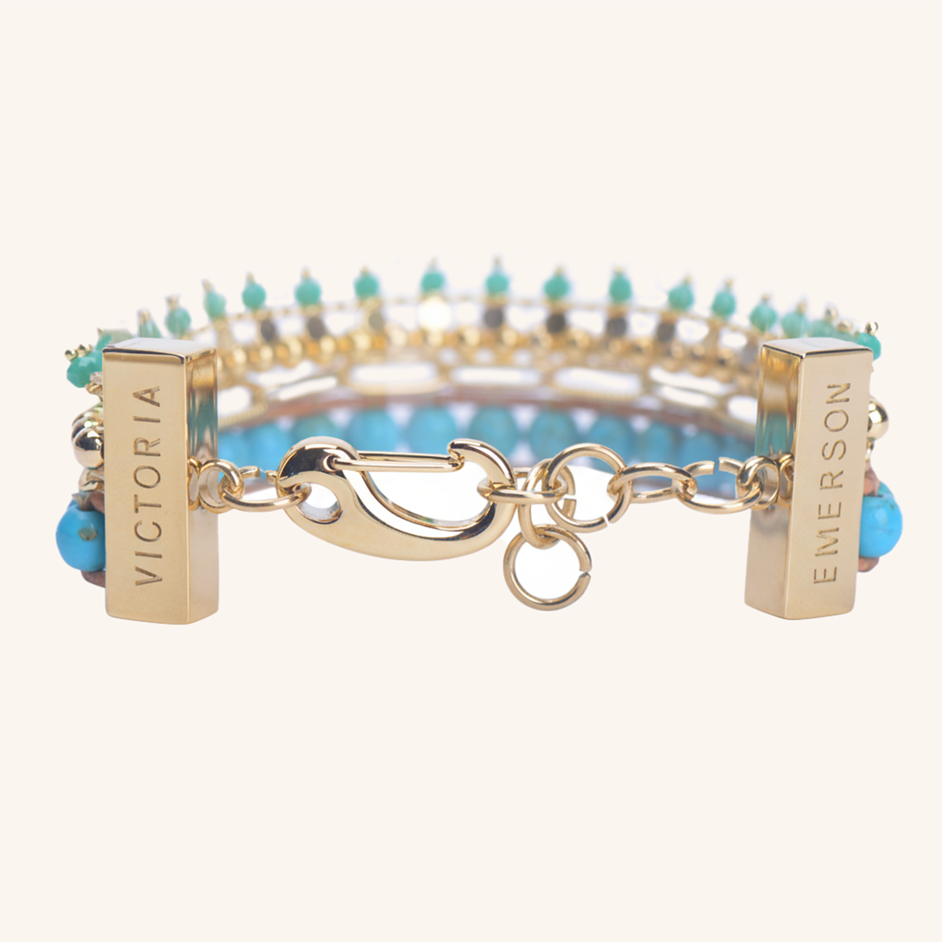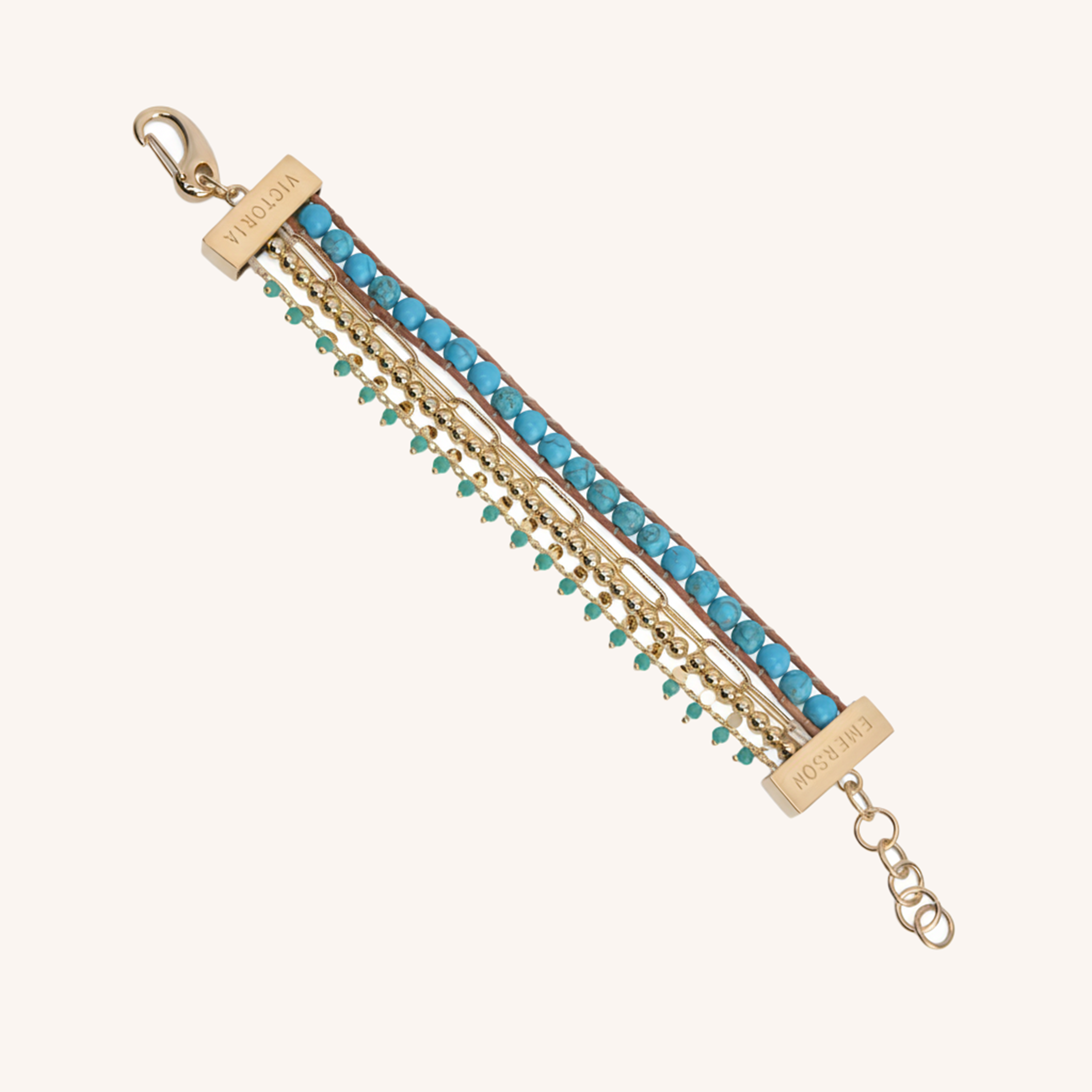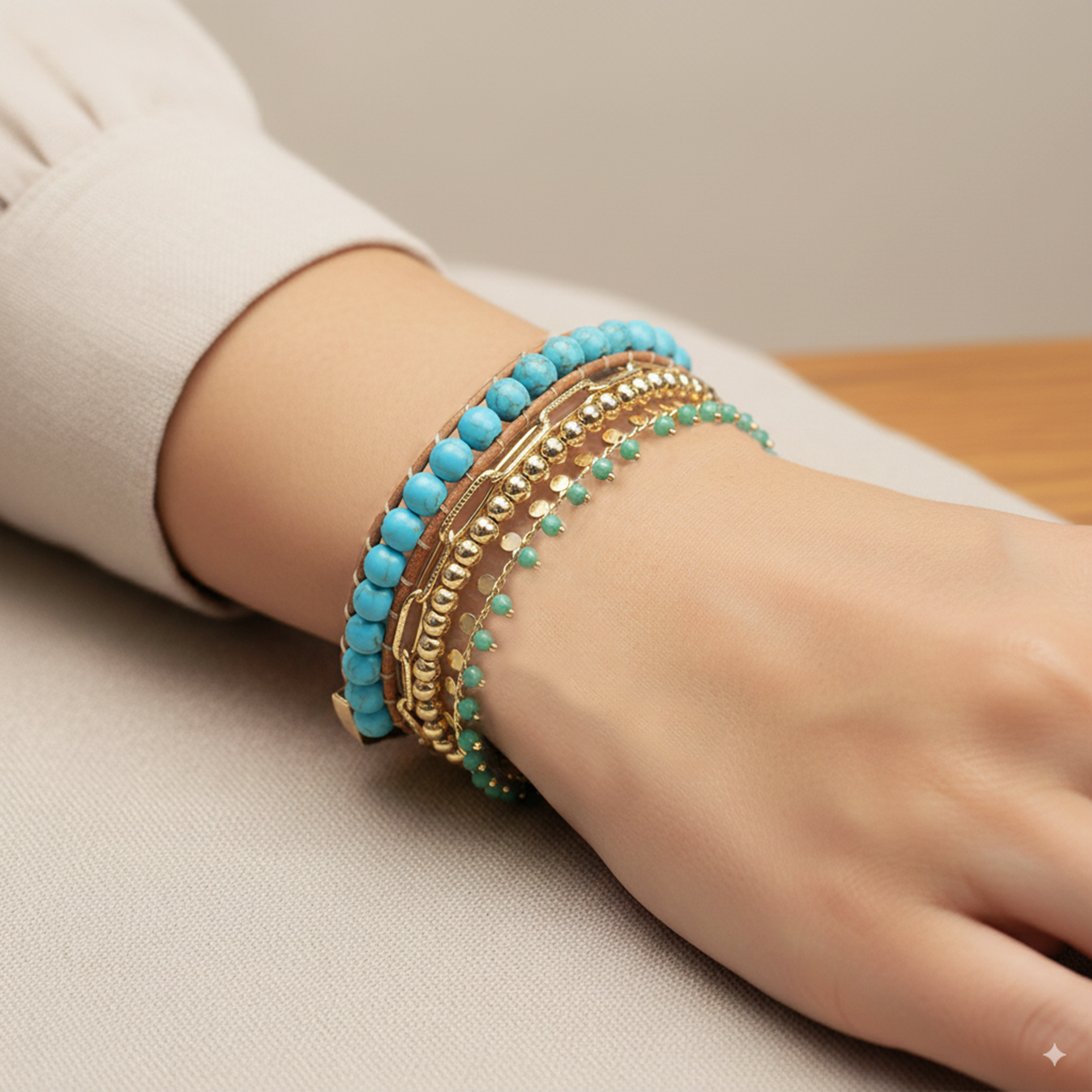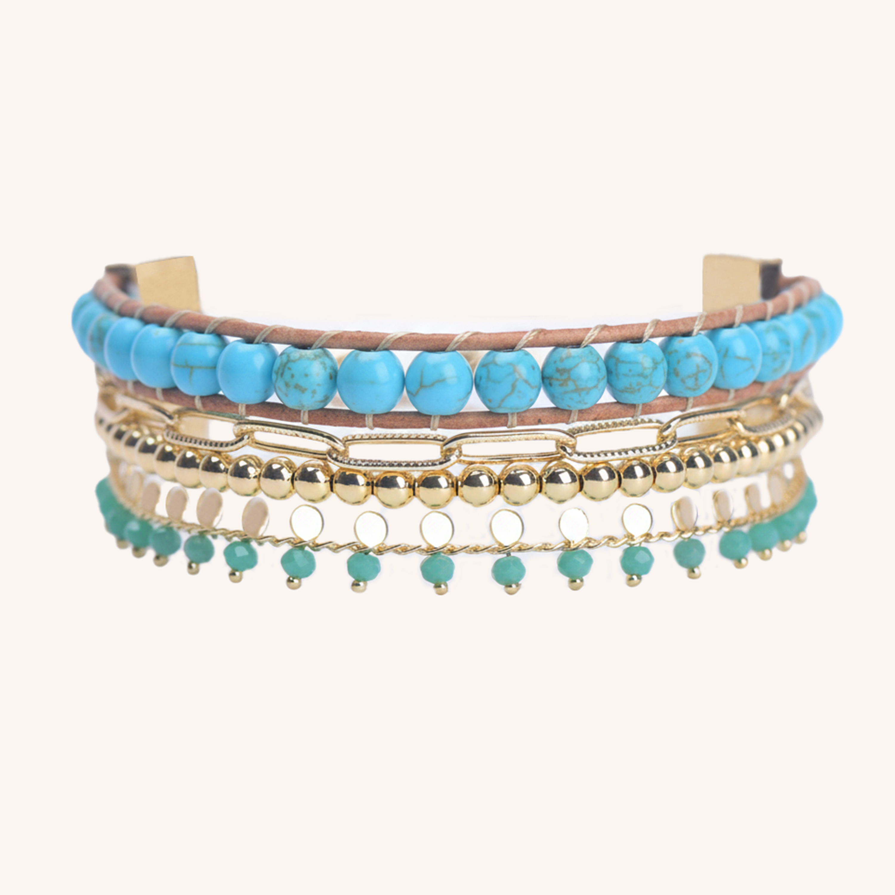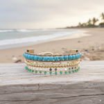 Stacked bracelets but all on one clasp. Trendy ball beads are mixed with turquoise beads  to make the perfect pre-layered piece.