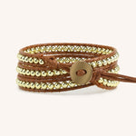 Elevate your everyday style with this refined three-wrap bracelet, where lustrous gold beads meet supple natural leather. The versatile design transitions seamlessly from casual to formal occasions, while the adjustable wrap construction ensures a personalized fit for any wrist.