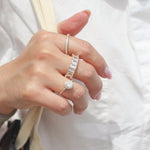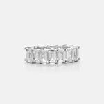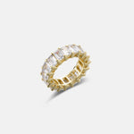 This eternity ring features baugette cut crystals all around. Solid Sterling Silver is plated in 14K Yellow or White Gold for the ultimate shine. Available in sizes 6-9.