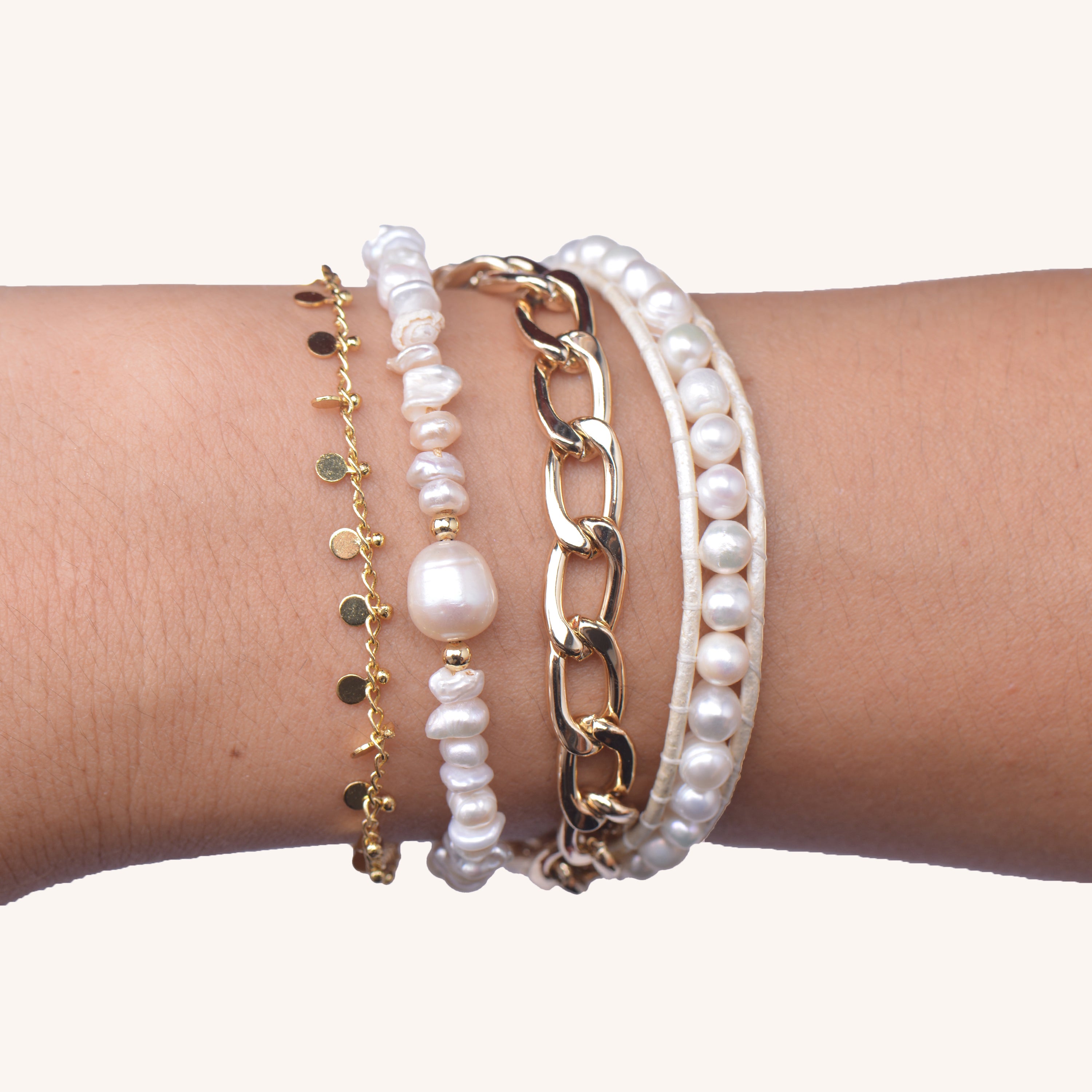 Stacked bracelets but all on one clasp. Trendy ball beads are mixed with pearls and leather to make the perfect pre-layered piece.