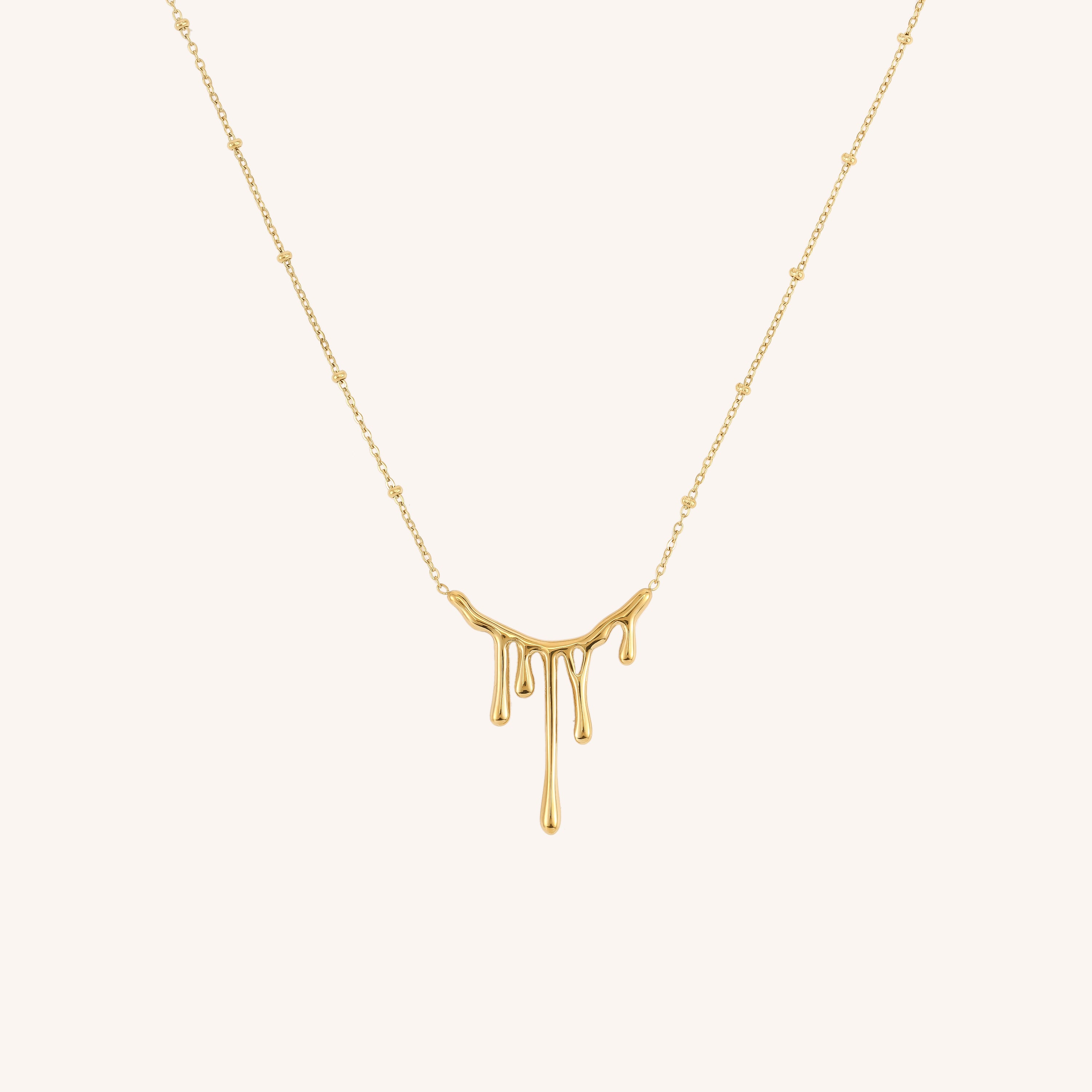 Embrace fluid elegance with this striking Melting Gold Necklace, where contemporary design meets timeless luxury. The sculptural pendant features a mesmerizing molten aesthetic that catches light beautifully, creating an ever-shifting play of dimension and depth.