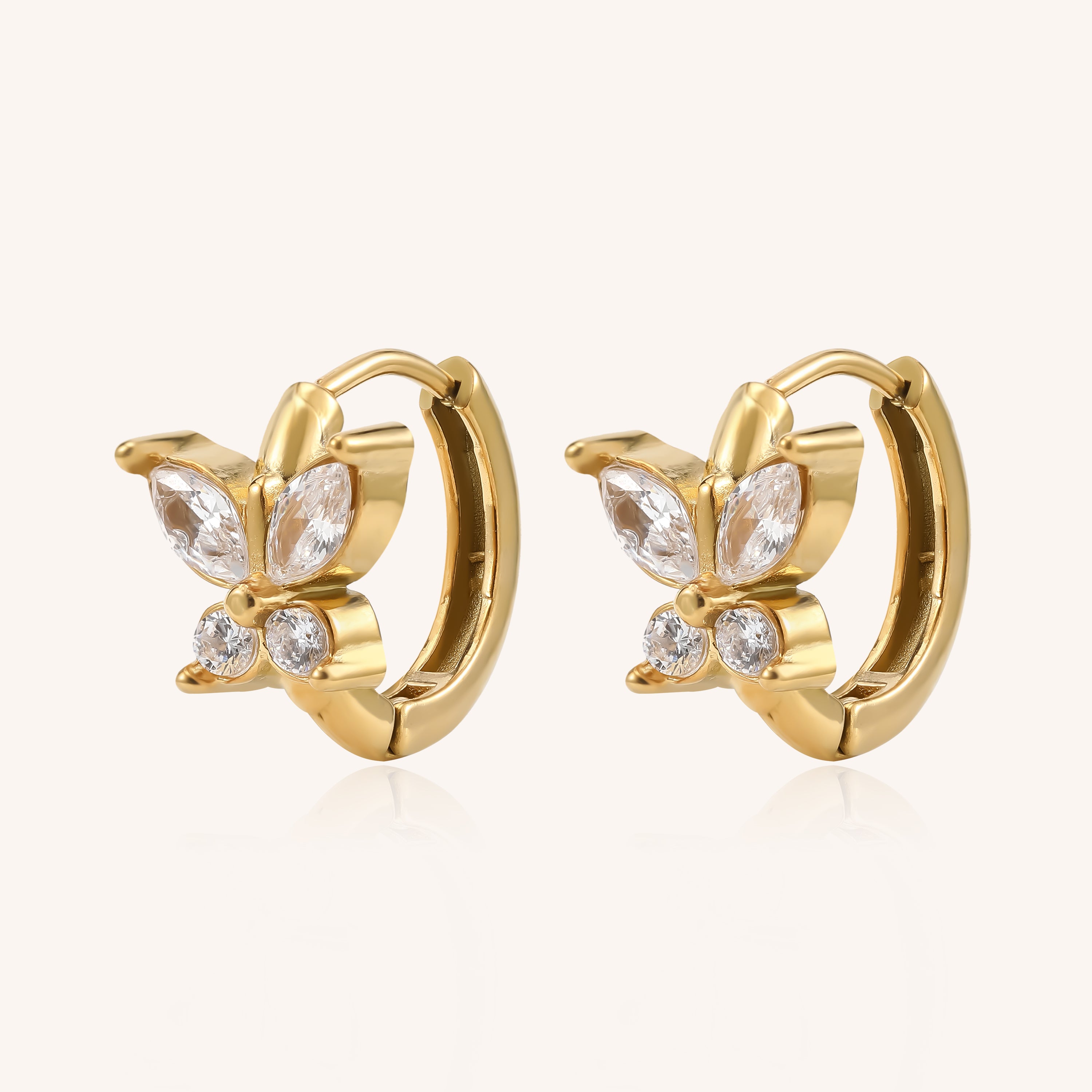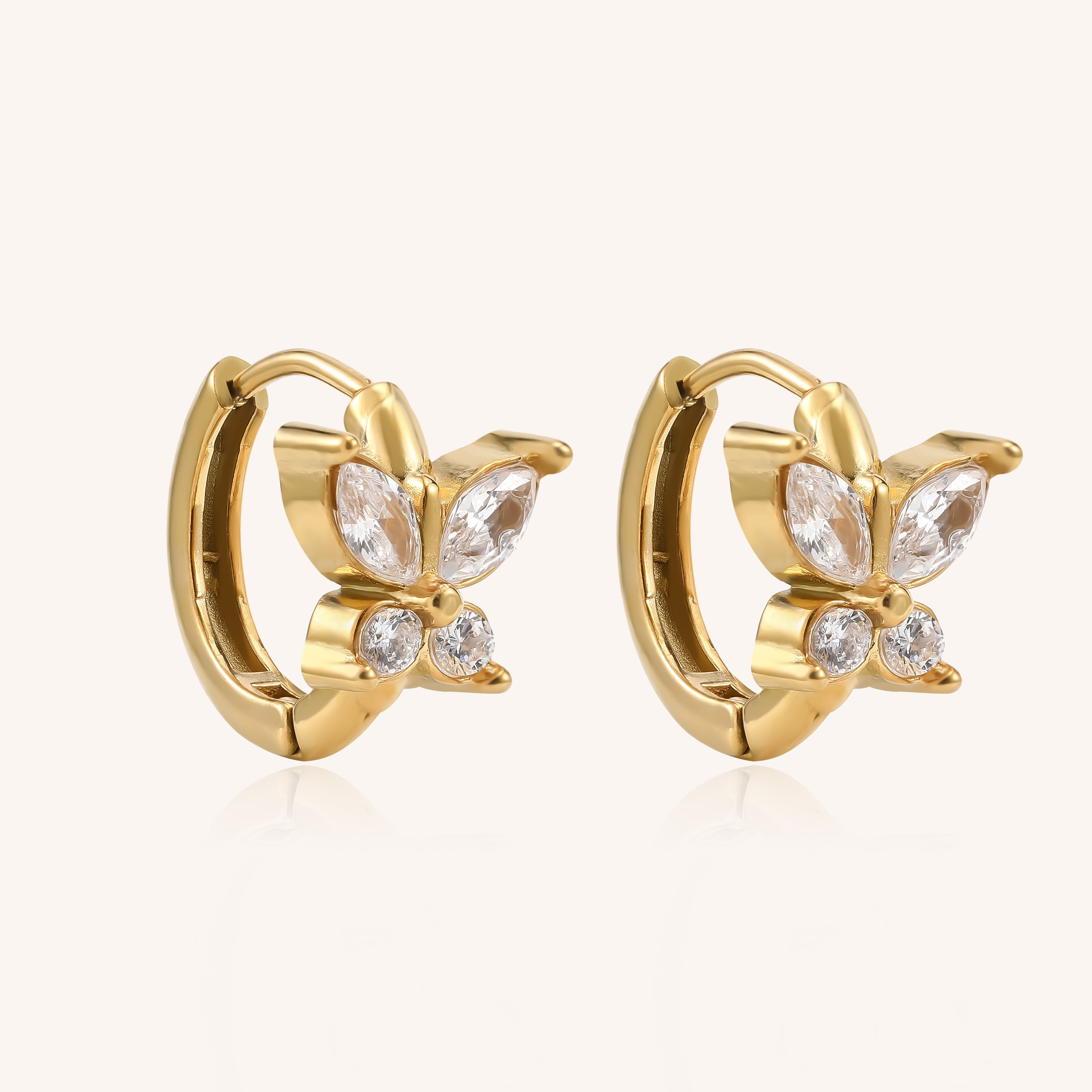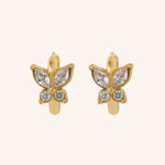 Delicate butterfly silhouettes dance within these refined mini hoops, capturing nature's elegance in wearable form. Crafted with meticulous attention to detail, each pair features graceful wings that frame the face with understated sophistication.