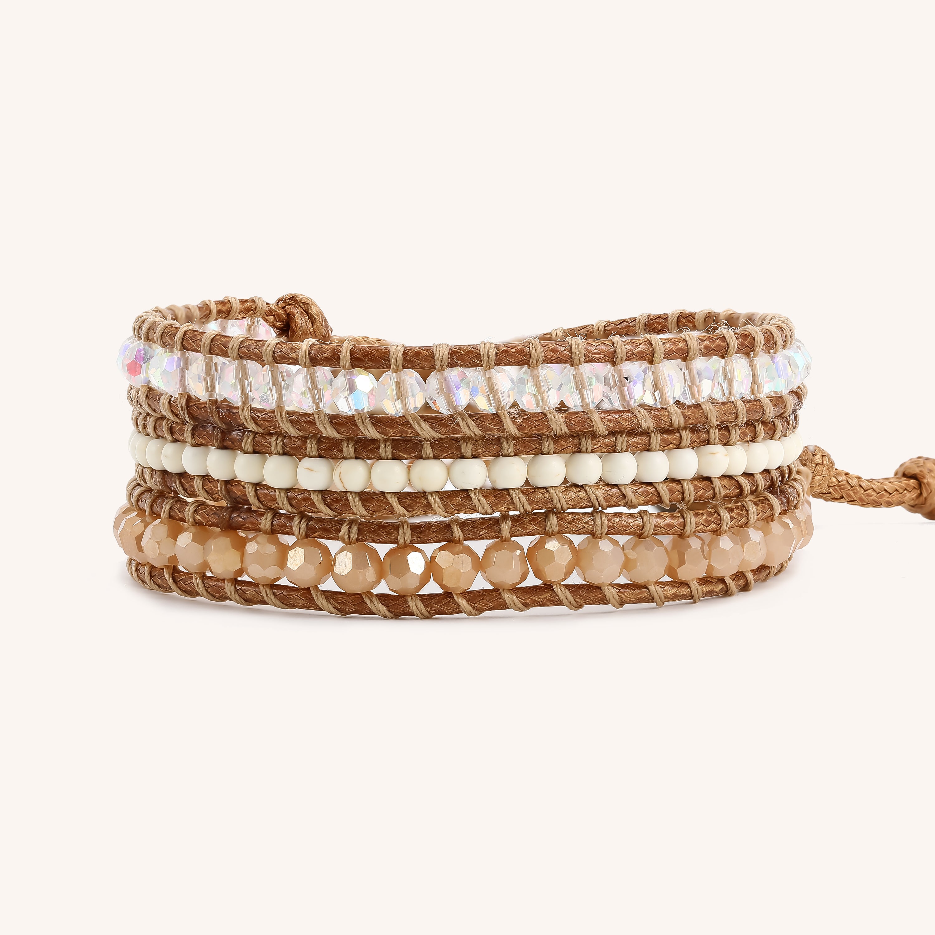 Elevate your everyday style with this refined three-wrap bracelet, featuring carefully selected neutral crystals set against supple natural leather.