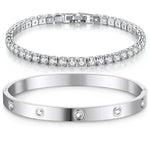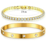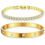 The Radiant Stack Tennis Bracelets capture effortless shine in gleaming gold. This versatile set features stackable bangles and a classic tennis bracelet design accented with sparkling cubic zirconia, creating a layered look that feels both refined and modern. Designed to be worn together or mixed with your favorites, these bracelets add polished elegance to everyday styling or special occasions.